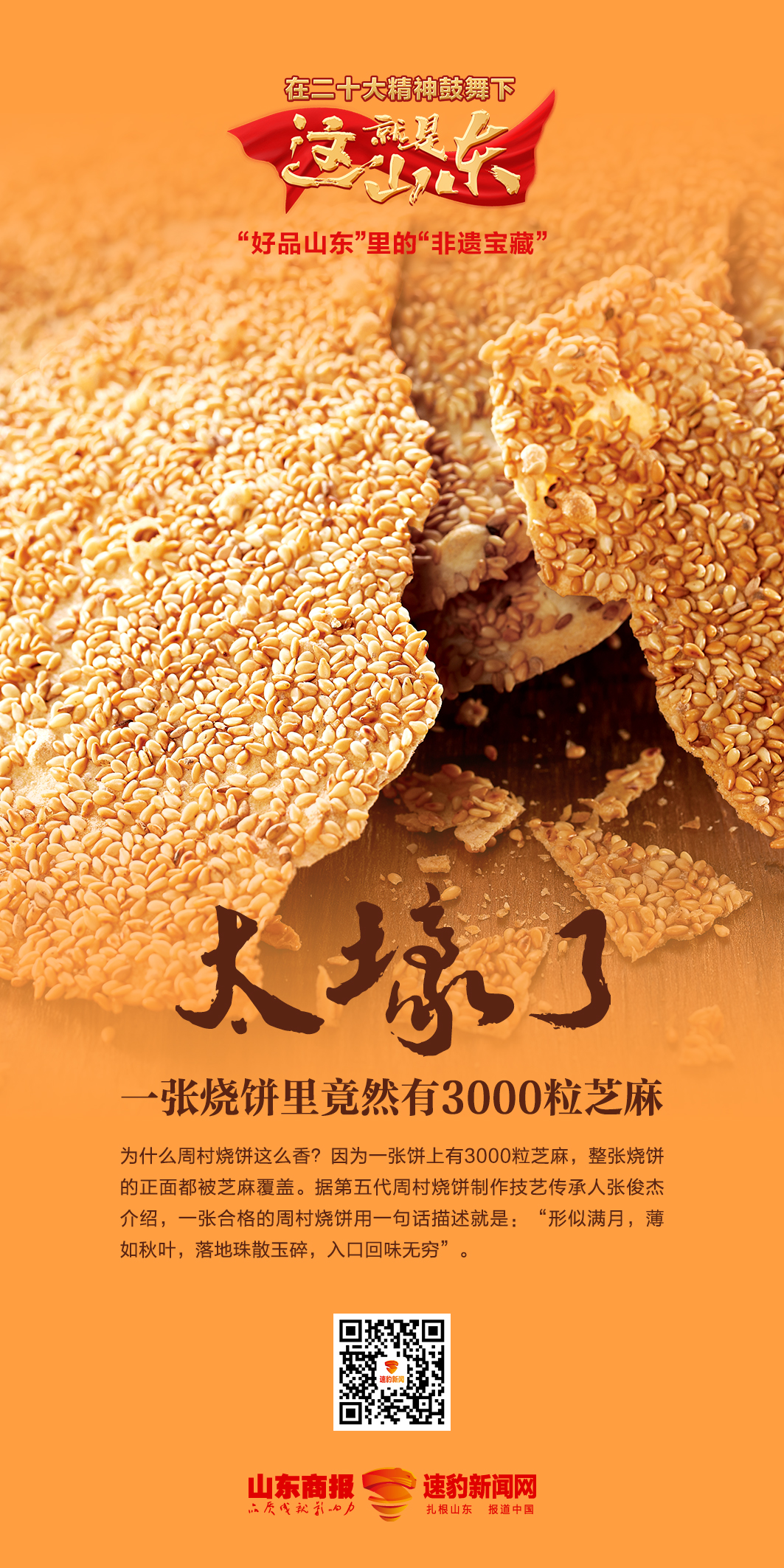 "好品""非遺"雙向加持,讓"山東力量"格外亮眼跟隨“好品山東”里的“非遺寶藏”網(wǎng)絡(luò)主題活動(dòng)的腳步,山東大地上一個(gè)個(gè)“好品”兼一項(xiàng)項(xiàng)非遺技藝,跨越時(shí)空躍然眼前。 周村燒餅“記”藝:一張燒餅上近3000粒芝麻“團(tuán)團(tuán)如月麻如星,星月和酥燮理成!弊詽h時(shí)從西域傳來,燒餅作為中華傳統(tǒng)小吃,備受各地老百姓的喜愛。隨著時(shí)間發(fā)展,燒餅也劃分出烤餅、芝麻燒餅、大酥燒餅、油酥燒餅等多種類型。 周村燒餅“記”藝在山東,提起大酥燒餅,很難不令人想到蜚聲海內(nèi)外的“周村燒餅”。作為老字號(hào)品牌,周村燒餅歷史悠久,其手工制作技藝入選國(guó)家級(jí)非物質(zhì)文化遺產(chǎn)代表性項(xiàng)目名錄、第一批“好品山東”品牌名單。近年來,緊跟時(shí)代發(fā)展步伐,周村燒餅在產(chǎn)品結(jié)構(gòu)升級(jí)和技術(shù)創(chuàng)新方面不斷發(fā)力,聚焦“兩創(chuàng)”新生,成為具有鮮明特色的地域性文化品牌,向著新的征程不斷邁進(jìn)。 |
